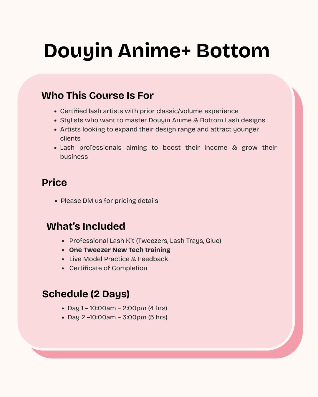 This intensive 2-day course focuses on advanced Anime & Bottom Lash techniques using our exclusive One Tweezer Method.